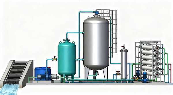(3)推荐工艺流程:原水首先经由取水口的格栅或筛网去除大型悬浮物;随后进入混凝工序,通过投加药剂使水中胶体杂质脱稳聚集;混凝后的水进入介质过滤器,实现悬浮颗粒的深层截留;出水再经过精密保安过滤器,确保水中微米级颗粒物被滤除;此后,根据水质特性投加RO药剂,以保护RO膜并提升系统性能;最后,预处理合格的水进入核心的RO反渗透系统,完成脱盐与纯化。