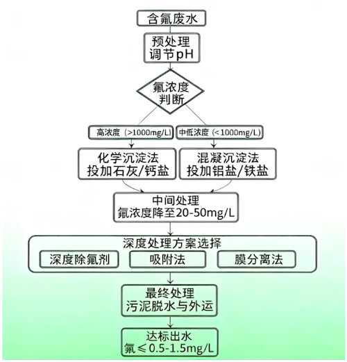 一个完整的含氟废水处理系统通常包含以下流程,具体可根据废水浓度和成分选择合适的工艺组合: